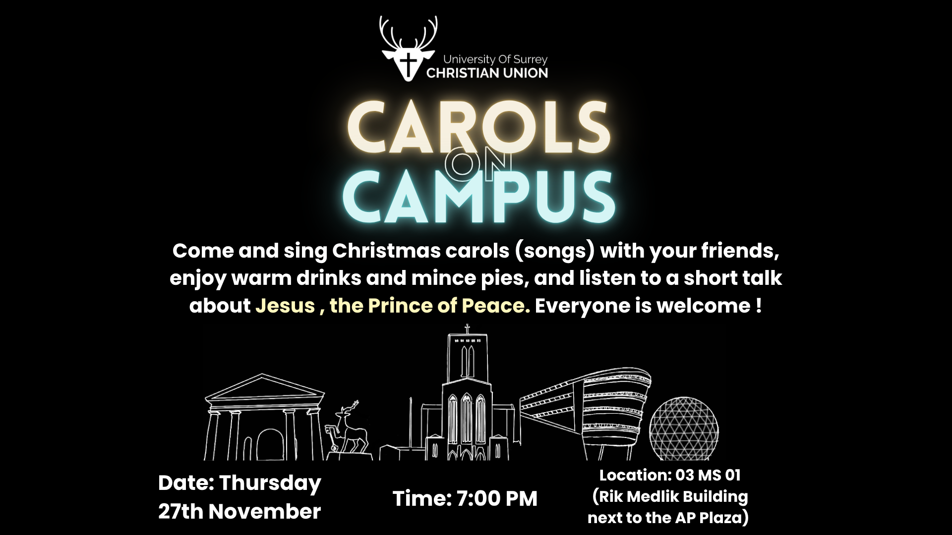 Come and join us to sing Christmas Carols (songs) with your friends, enjoy warm drinks and mince pies, and listen to a short talk about Jesus, the Prince of Peace. Everyone is welcome!